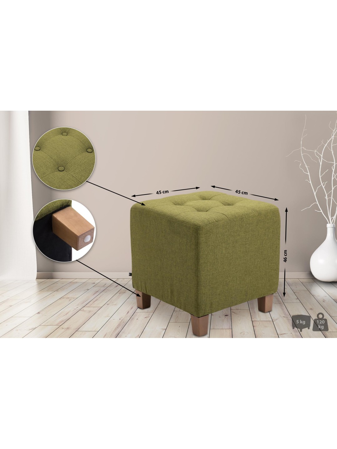 Kuutioistuin seisoo vankilla ja vakailla puisilla jaloilla, joten jakkara voidaan kuormittaa turvallisesti jopa 120 kg:lla. Lattiasuojien ansiosta herkät lattiat ovat suojassa.