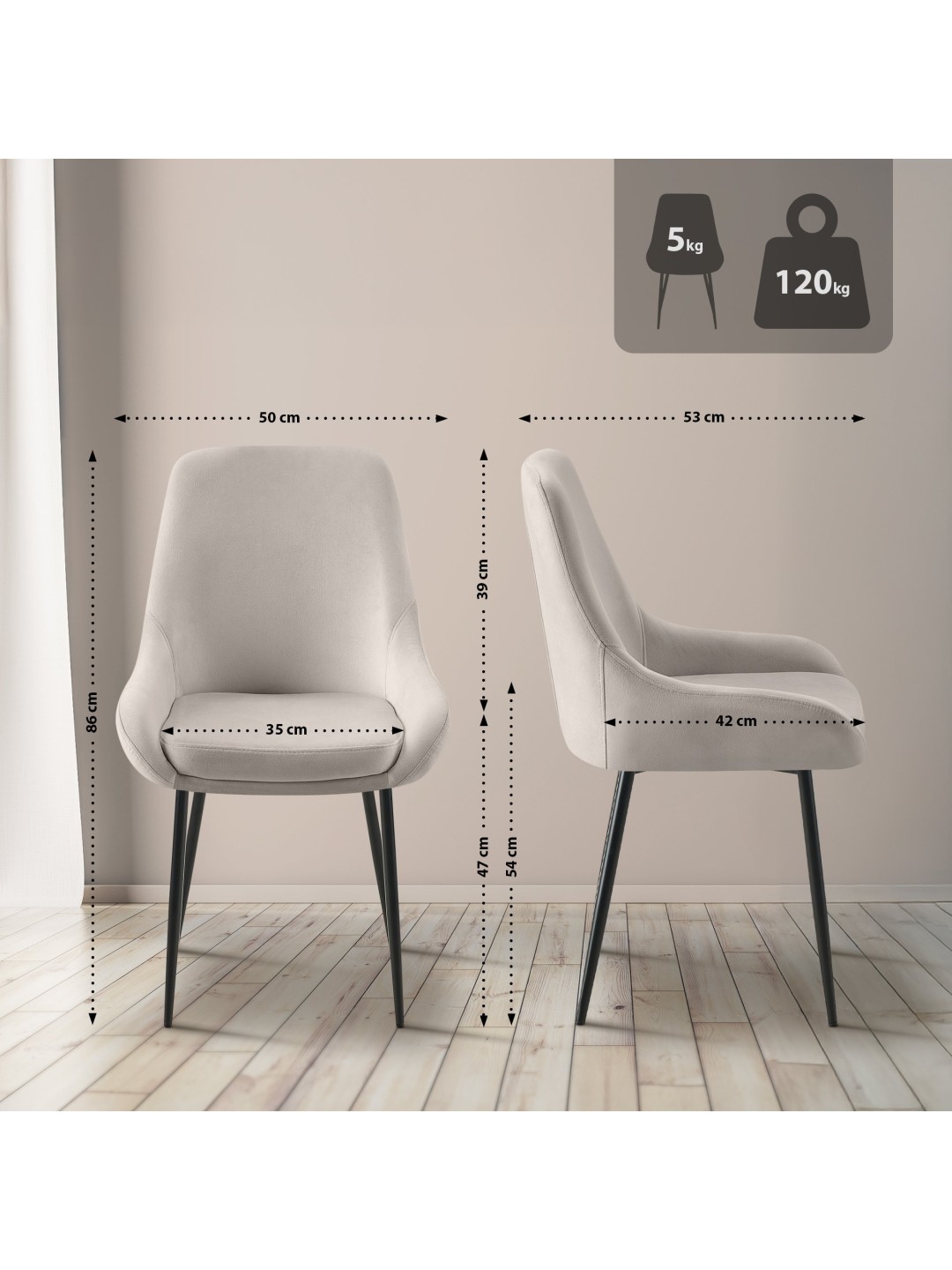 Koe tyylikäs ja mukava istumakokemus Elmira ruokatuolilla. Moderni ruokatuoli on täydellinen lisä jokaiseen ruokasaliin, kiitos sen tyylikkään muotoilun korkealaatuisesta sametista. Vankka työstö ja vankka rakenne luonnehtivat Elmira-tuolia, joka kestää jopa 150 kg. Kiinteän 47 cm:n istuinkorkeuden ja pehmustetun istuimen ansiosta se tarjoaa optimaalisen mukavuuden pitkiä aikoja.